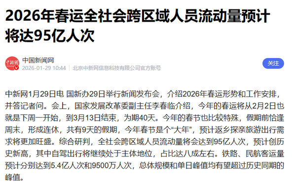 据CNMO了解,春运作为春节期间最受关注的民生场景,交通运输部预测2026年其全国跨区域人员流动量将达95亿人次,其中自驾出行将处于主体地位,占比达八成左右。铁路、民航客运量预计分别达到5.4亿人次和9500万人次。